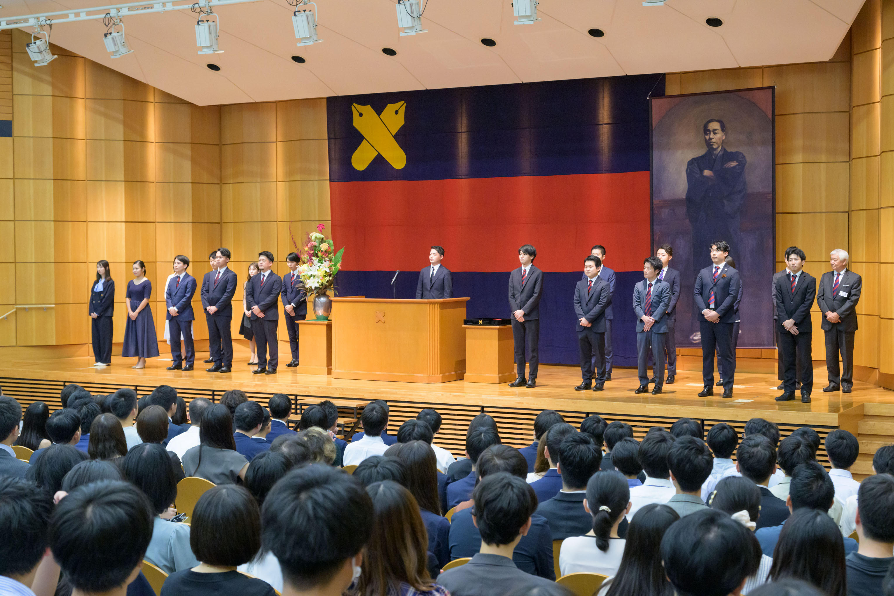 卒業5年塾員招待会 開催9月20日(土)14時30分より卒業5年塾員招待会式典が三田キャンパス西校舎ホールで挙行されました。参加対象者は2019年9月通信課程並びに2020年度通学課程、通信課程の卒業・修了生(塾員)となり、当日は合計1,000人以上の塾員が三田のキャンパスに集まりました。参加者多数のため、西校舎ホールに入場できなかった参加者は西校舎519教室内で式典の模様を見守りました。
